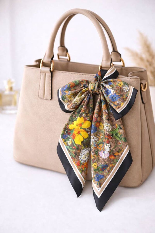 Laissez-vous séduire par Jardin d’Automne, un foulard aux nuances chaleureuses sublimées par un imprimé floral riche et vibrant. Ses teintes profondes mêlent éclats de jaune, touches de rouge et notes de bleu sur un fond naturel élégant.